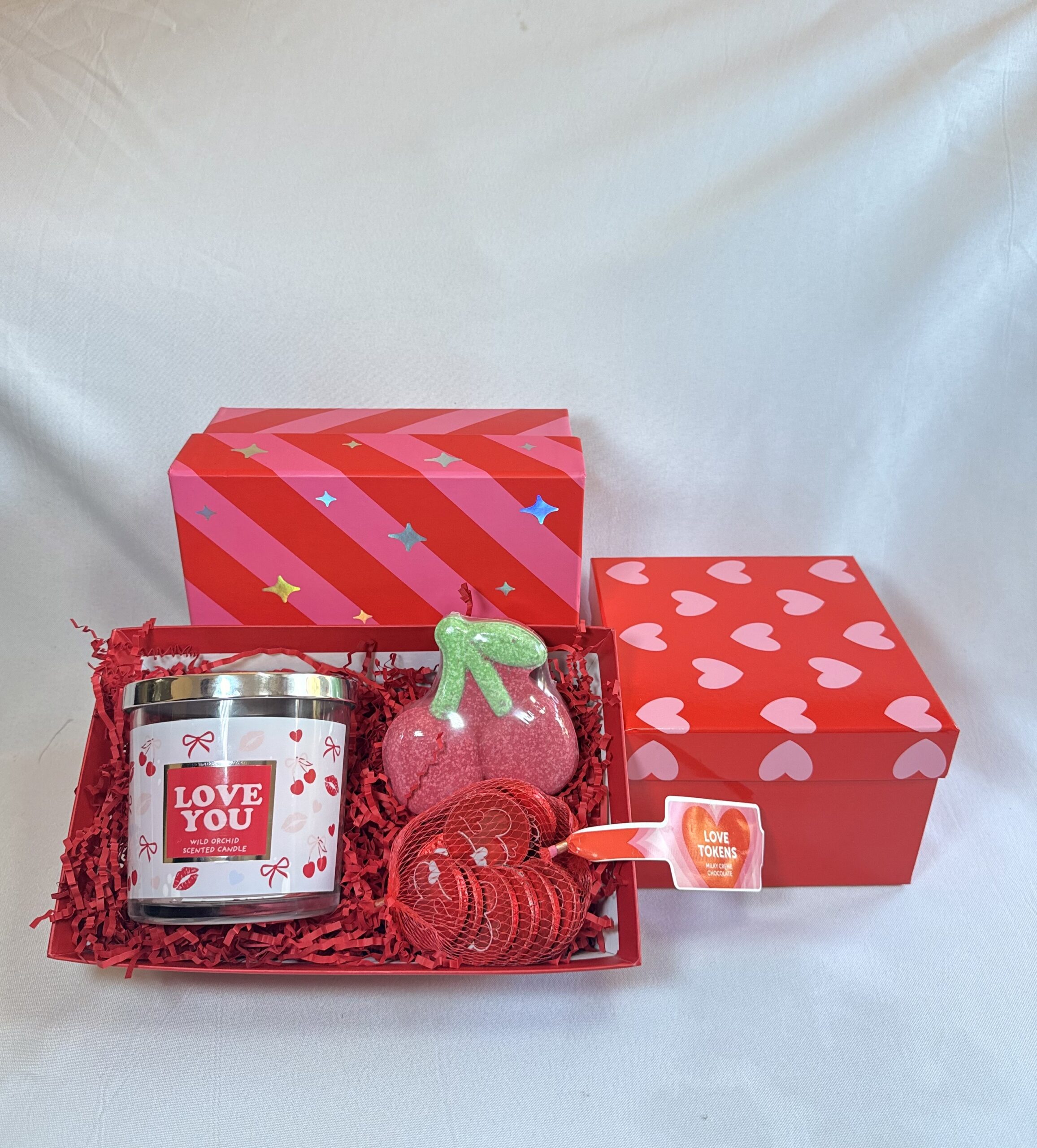 A sweet Valentine’s mini hamper featuring a “Love You” candle, cherry bath bomb fizzer and Love Tokens chocolates — perfect for a cosy night in.