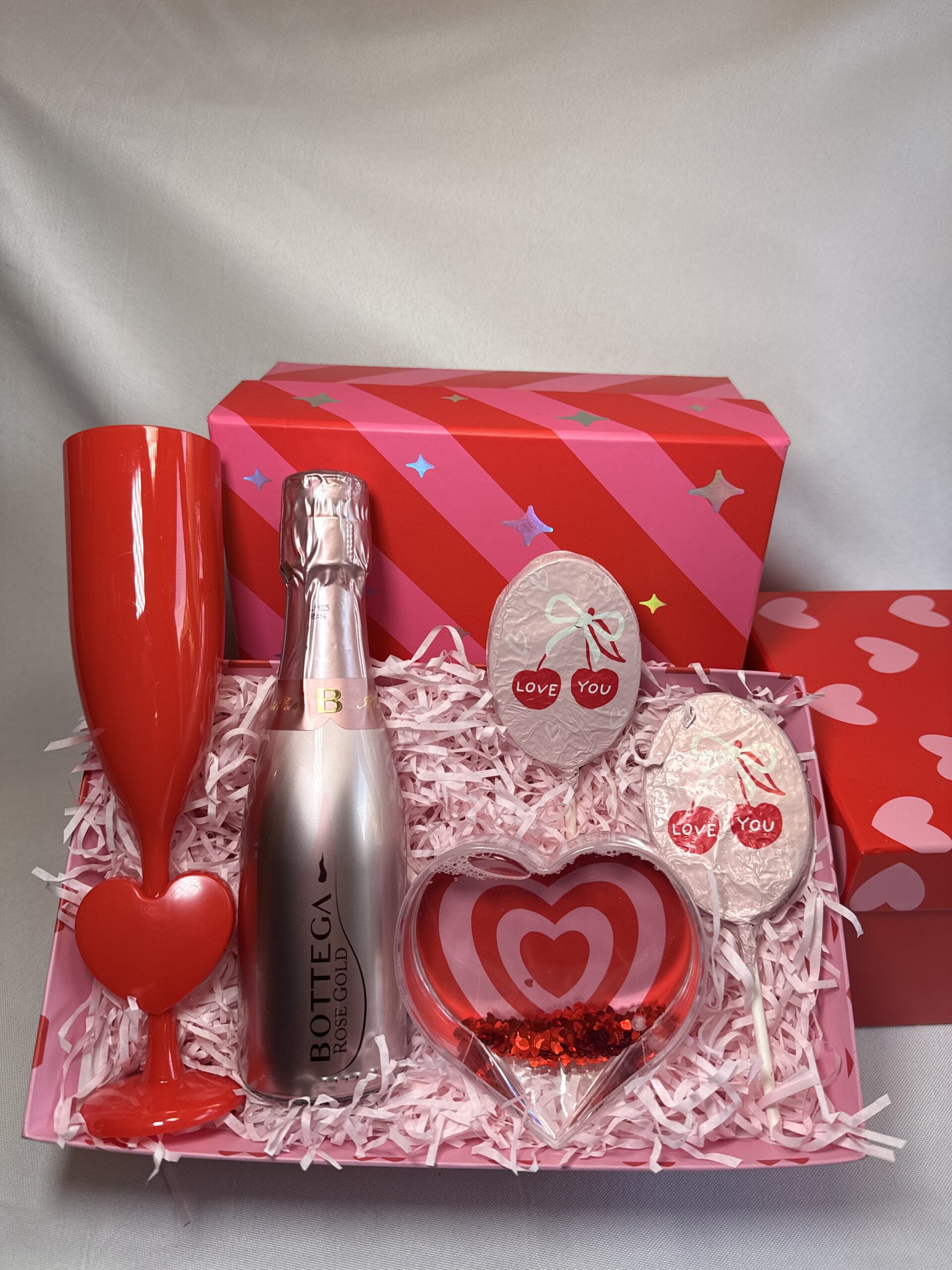 Sweet, celebratory and made to impress. The Hearts & Bubbles Hamper is the ultimate Valentine’s gift for someone who loves romantic details and a little luxury. Featuring Bottega Rosé Gold, a bold red Valentine flute, and adorable “Love You” chocolate lollies, this hamper is perfect for setting the mood and making any moment feel special.